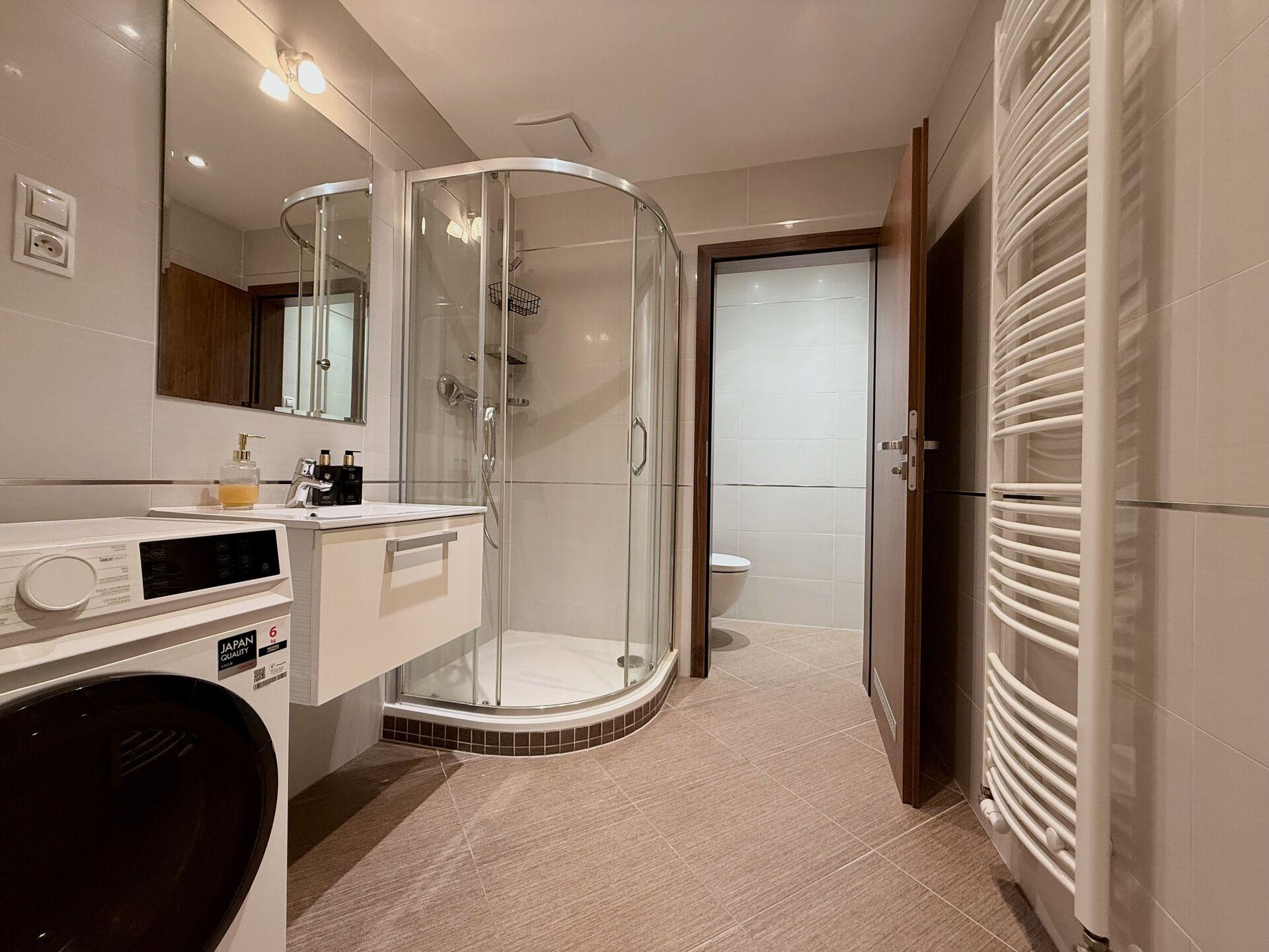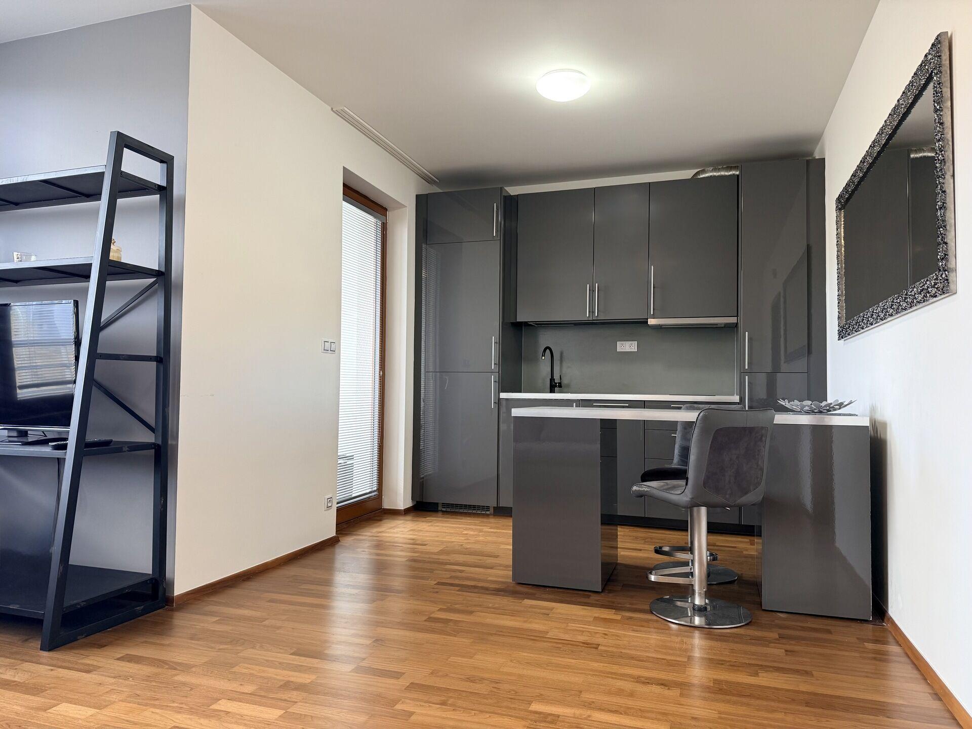 Jednotka nabízí prostornou vstupní halu s vestavěnou šatní skříní, následuje koupelna se sprchovým koutem, podlahovým topením a pračkou; dále samostatné WC. Obývací pokoj disponuje sedací soupravou, televizí a TV stěnou, kuchyňský kout nabízí menší lednici s mrazákem, myčkou, barovým pultem a dvěma židlemi.